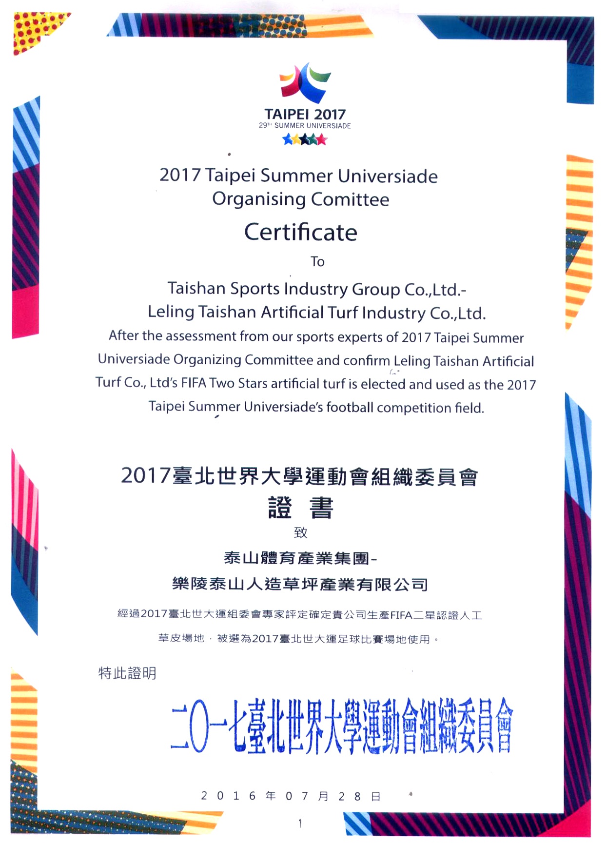 获得国际足联FIFA、国际曲联FIH、国际网联ITF